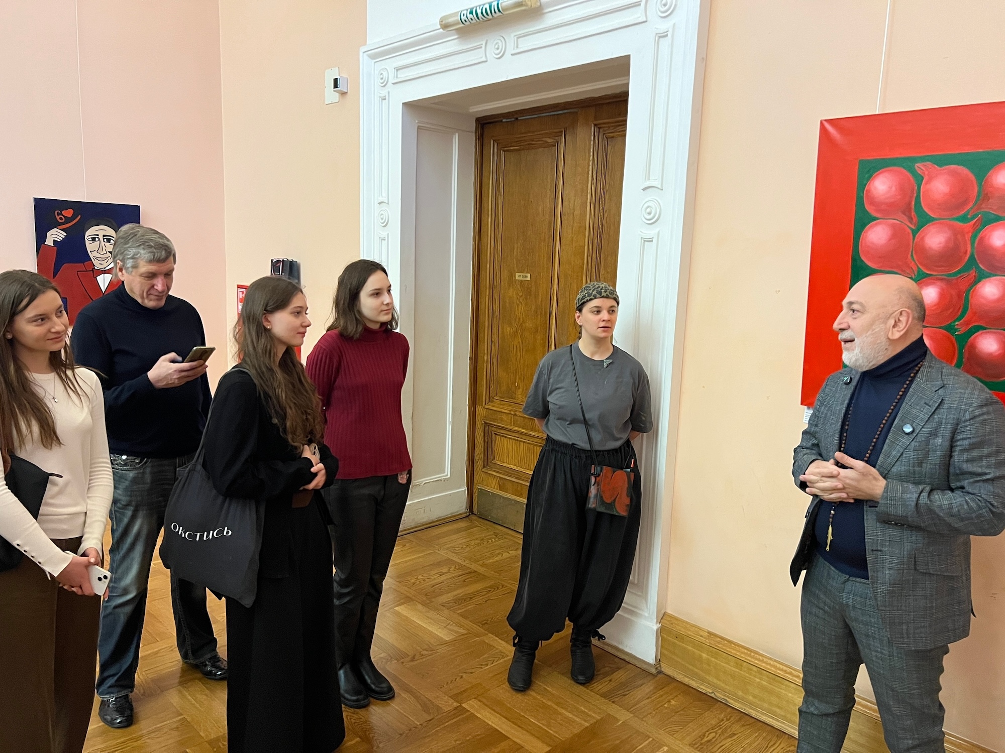 По приглашению выпускницы факультета искусств дизайнера и художницы Екатерины Дильбази студенты факультета посетили организованную ею выставку художника Александра Дильбази «Когда цветет гранат» в пространстве Российской государственной библиотеки. В Розовом зале, где разместилась экспозиция, будущие искусствоведы стали участниками встречи с художником, и, пользуясь непосредственным общением с автором, оттачивали навыки экспертного анализа произведений искусства. Первокурсники, оказавшиеся в библиотеке впервые получили заветные читательские билеты и уже начали изучать богатейшие фонды. Выражаем благодарность Екатерине и Александру Дильбази за приглашение и поддержание связи с факультетом!